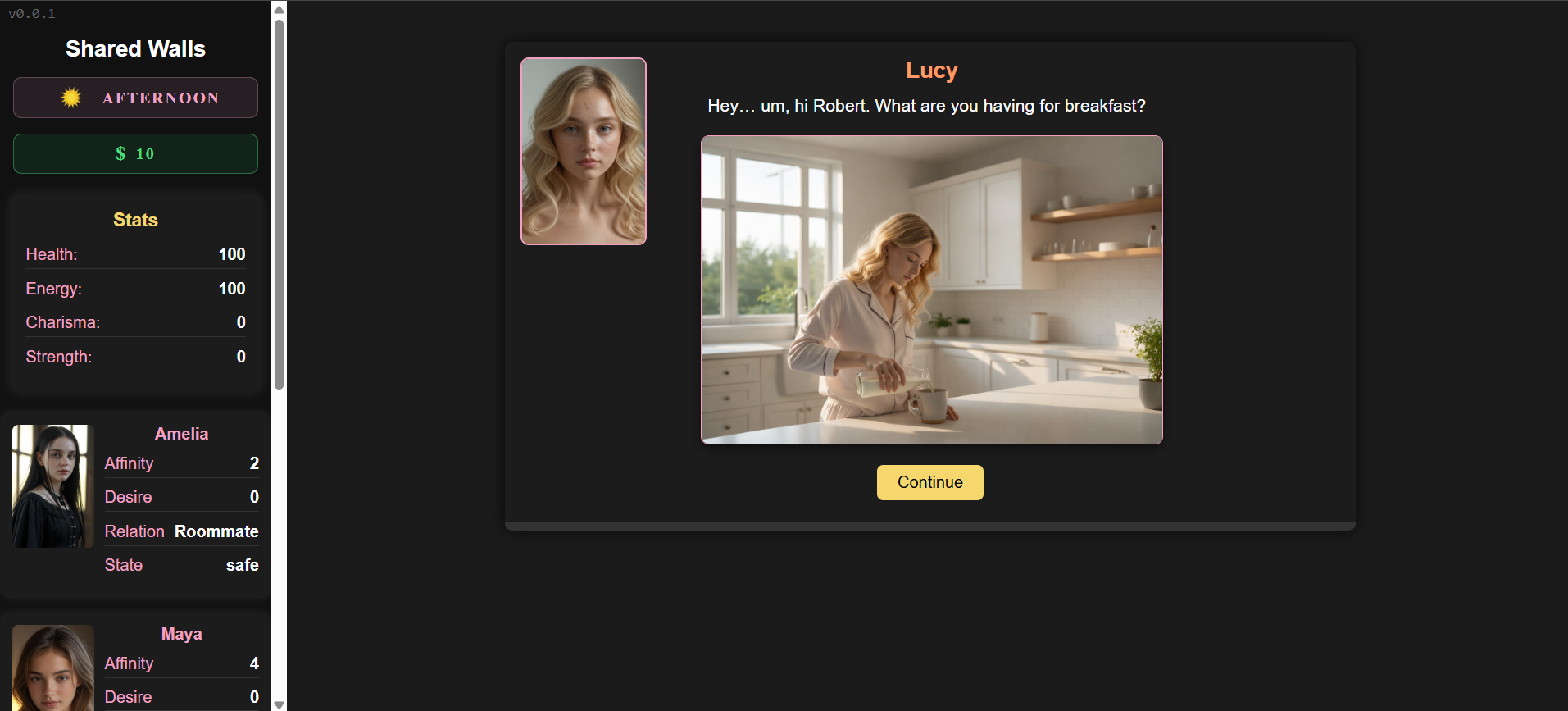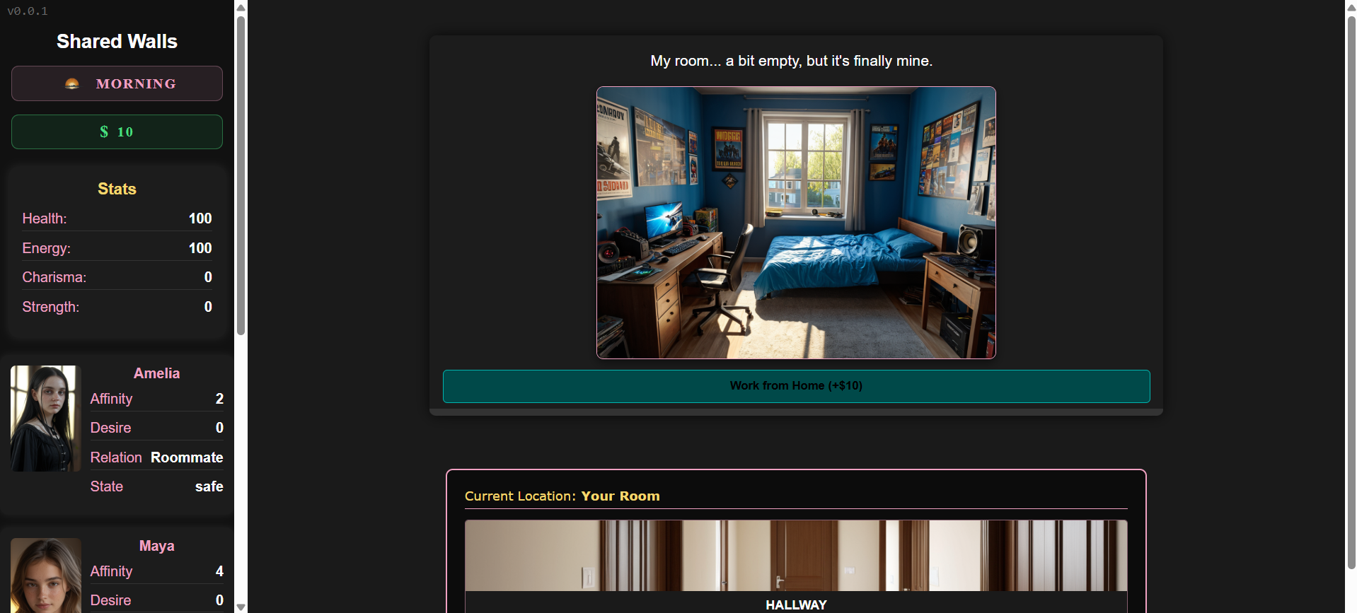 In Shared Walls you play as a young man who inherits a large house and decides to rent out three rooms to afford keeping it. What starts as a practical decision slowly turns into complex relationships shaped by the player's choices.